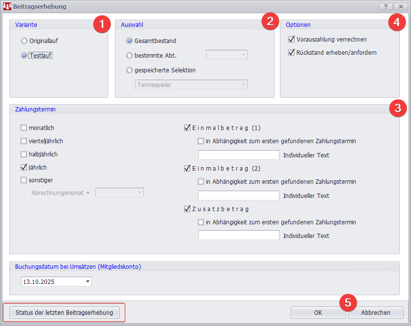 Testlauf (Empfohlen): Dies ist eine risikofreie Simulation. Das Programm berechnet alle Beiträge, erstellt am Ende eine detaillierte PDF-Kontrollliste, aber verändert keinerlei Daten in Ihrer Mitgliederverwaltung. Ihre Vorteile: Sie können alle Einstellungen in Ruhe prüfen, die zu erwartenden Einnahmen sehen und sicherstellen, dass alles korrekt ist, bevor Sie den finalen Schritt gehen. Führen Sie vor jedem Originallauf einen Testlauf durch!