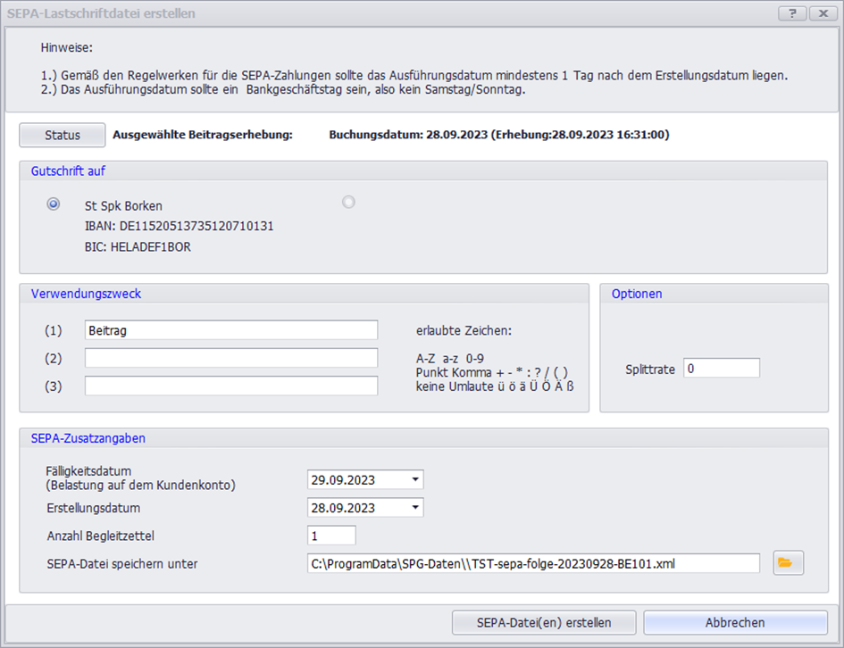 Große SEPA-Dateien aufteilen (Splitrate) Damit Ihre Bank eine SEPA-Datei nicht wegen zu großer Datenmenge ablehnt, sollten Sie diese aufteilen. Wir empfehlen, die „Splitrate“-Funktion ab einer Größe von etwa 800 Lastschriften zu verwenden.