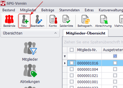 Um ein neues Mitglied anzulegen, klicken Sie oben links auf das Icon „Neu“
