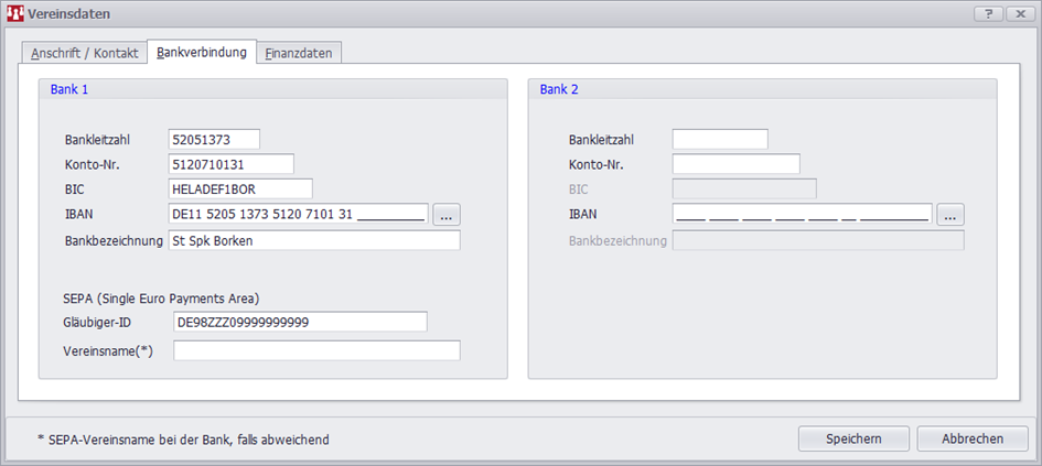 Im Register Bankverbindung sind der *SEPA-Vereinsname und die Gläubiger-ID hinterlegt.