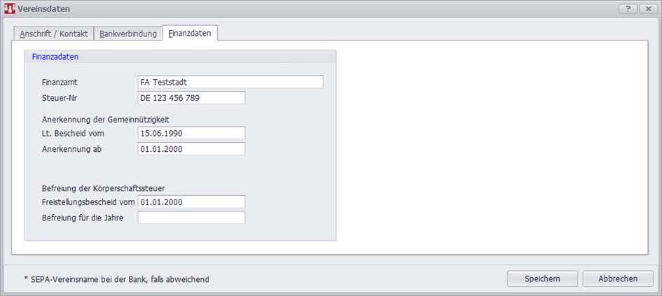 Im Register Finanzdaten erfassen Sie sämtliche Angaben, die für die finanzielle Verwaltung relevant sind. Diese werden z. B. bei Spendenbescheinigungen in die Formularfelder eingesetzt.