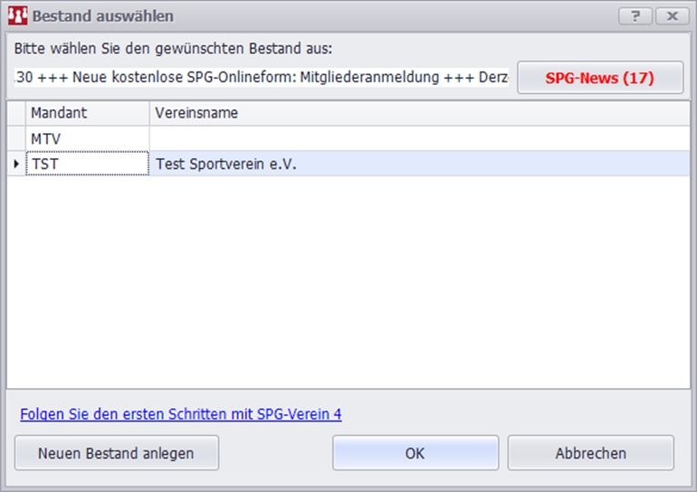 Im Test-Bestand können Funktionen von SPG-Verein 4 getestet werden. Hier sind eine Daten fiktiver Mitglieder enthalten.