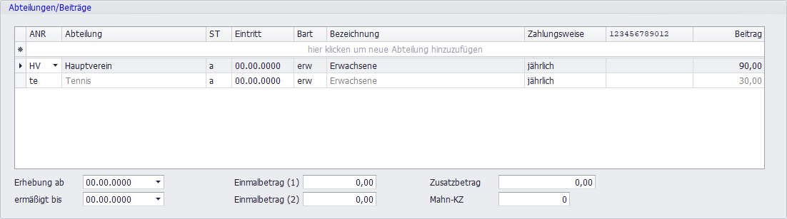 Abteilungszuweisung (ANR) Hier weisen Sie das Mitglied einer oder mehreren Abteilungen zu (z.B. Hauptverein, Tennis, Fußball). Jede Zeile steht für eine separate Zugehörigkeit mit eigenen Beitragsregeln.