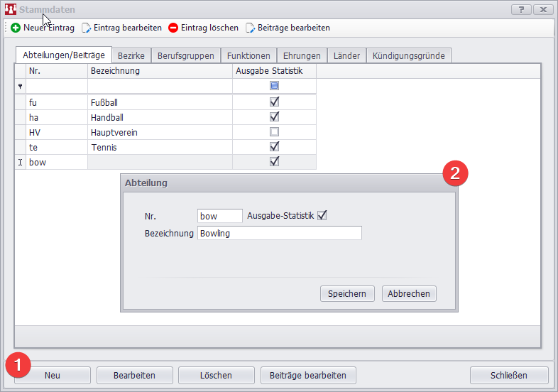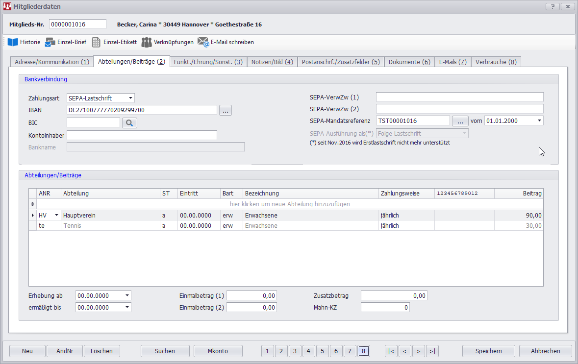 Mitgliederdaten > Registerkarte > Abteilungen/ Beiträge