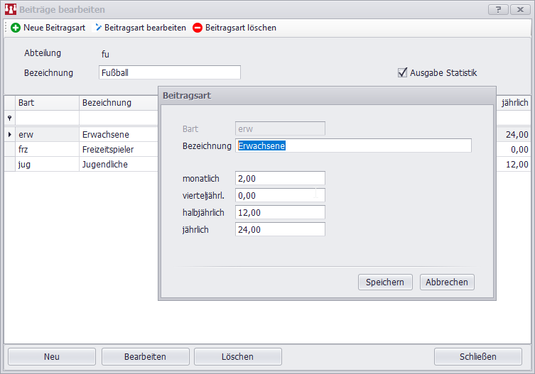 Die Beiträge können über den Button Bearbeiten oder per Doppelklick auf die jeweilige Abteilung und auf die Beitragsart (Bart) geändert werden.