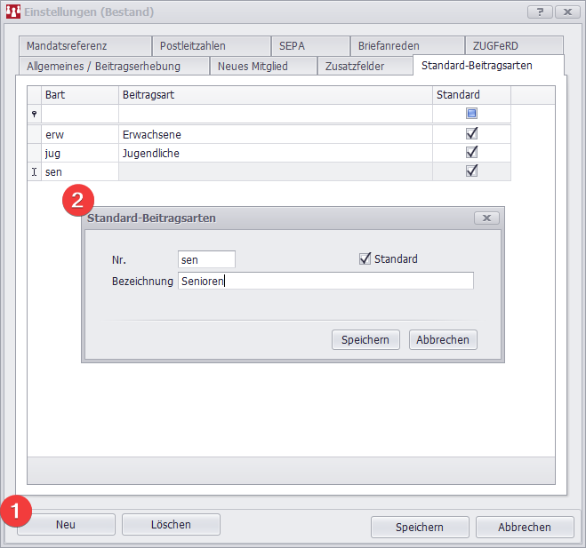 Die Standard-Beitragsarten erleichtern, das spätere Anlegen von Abteilungen und deren Beiträge.