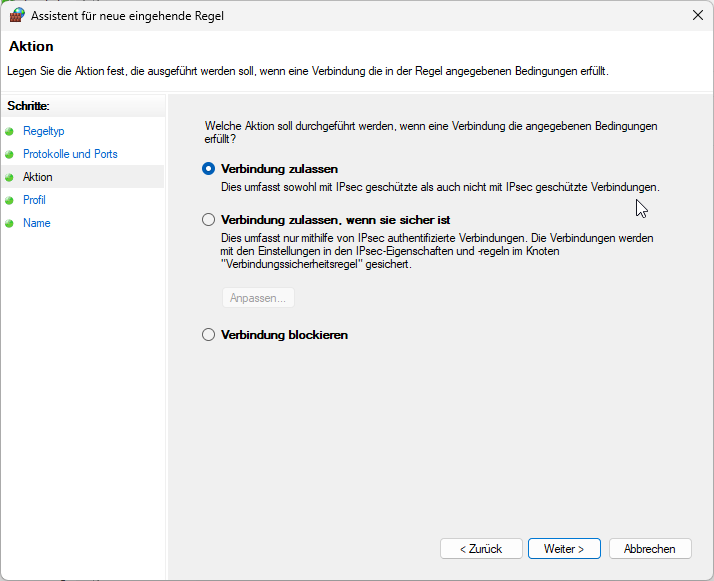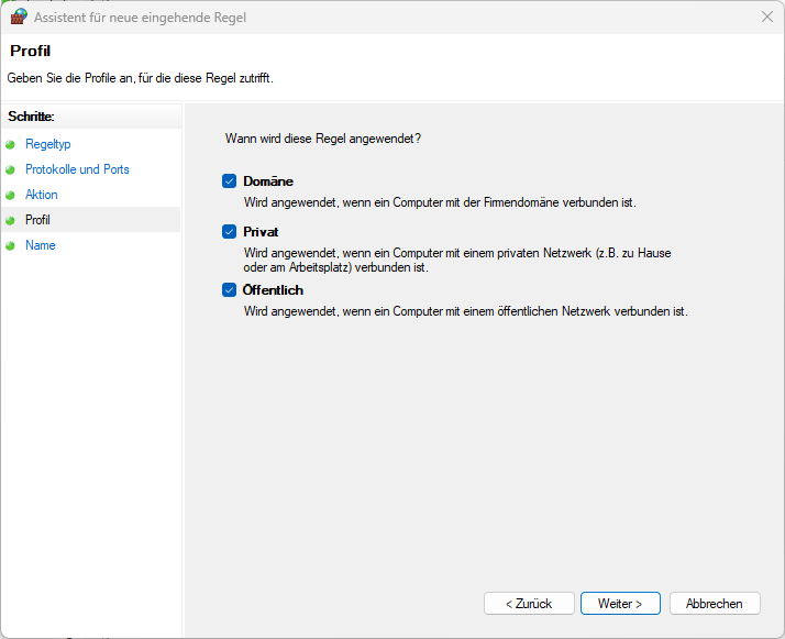 Wählen Sie die gewünschten Profile aus und vergeben Sie einen passenden Namen für die Regel.