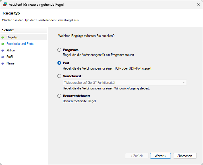 Wählen Sie diesmal UDP aus und tragen Sie als Port 1434 ein.