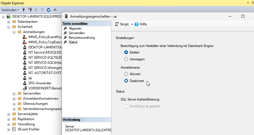 Nachdem Sie sich mit dem SPG-Anwender angemeldet haben, können Sie den sa unter Eigenschaften und Status auf Deaktiviert setzen.