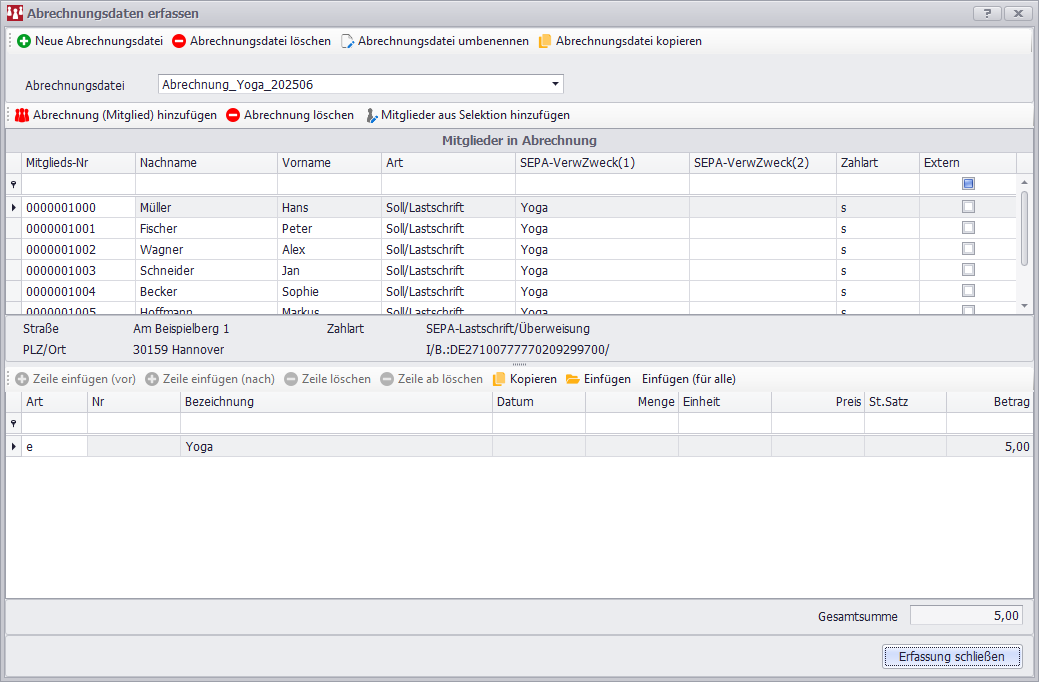 Im Formular Abrechnungsdaten erfassen werden die Abrechnungsdaten der Kursteilnehmer zentral erfasst und bearbeitet.