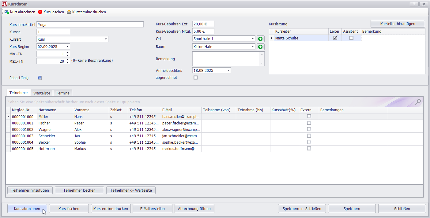 Die Abrechnung wird anschließend in den Kursdaten vermerkt: