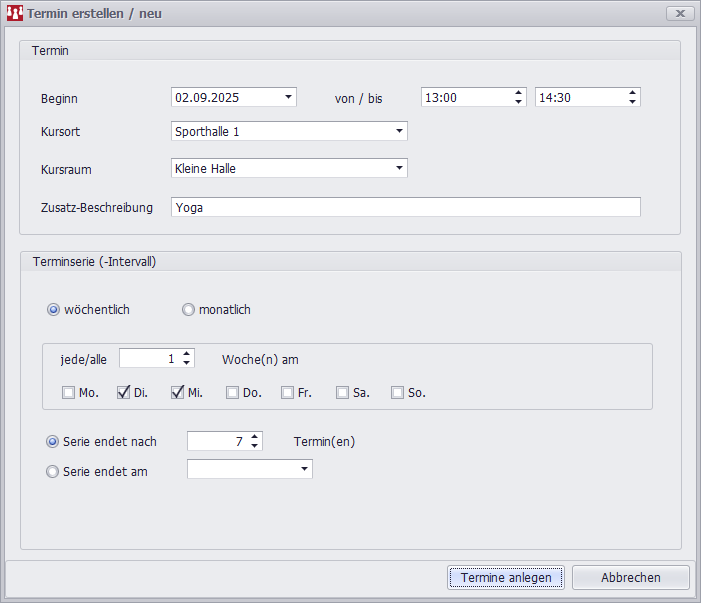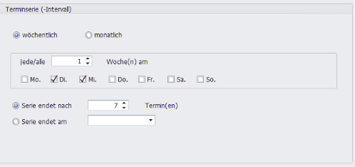 Der Bereich Terminserie dient der Erstellung von wiederkehrenden Terminen (z. B. wöchentliche Kurse).