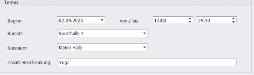| Raum | Auswahl oder Anlage eines Raumes (siehe Stammdaten (Kurs)) |