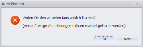 Sofern Sie den zu löschenden Kurs bereits abgerechnet haben, müssen die Kursabrechnungen manuell gelöscht werden.
