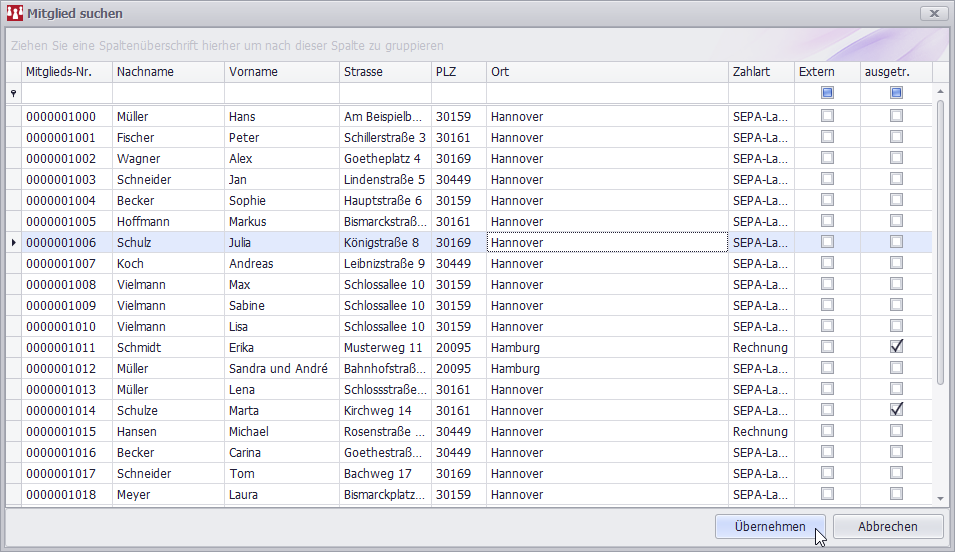 Über die Schaltfläche Kursleiter hinzufügen fügen Sie weitere Personen hinzu. Klicken Sie hierzu auf den Button, wählen Sie ein Mitglied aus und bestätigen Sie Ihre Auswahl mit Übernehmen: