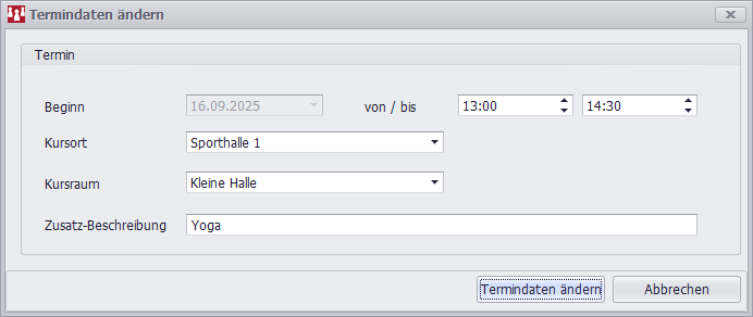 Das Formular dient dazu, bereits angelegte Termine in der Kursverwaltung zu bearbeiten und bezieht sich ausschließlich auf Einzeltermine.