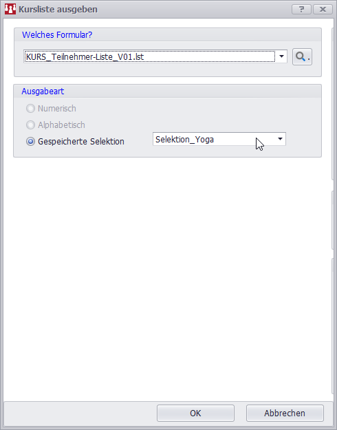Um eine Liste zu generieren zu können, müssen im Vorfeld die betreffenden Mitglieder als Selektion gespeichert werden. Diese ist im Feld Ausgabeart auszuwählen. Hierzu finden Sie weiterführende Informationen in dem Kapitel Kursübersicht (Kurs als Selektion speichern).