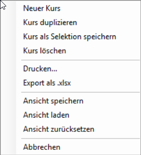 Sie können die Kursübersicht individuell anpassen (z.B. durch die Auswahl der Spalten und die Sortierung der Daten). Hierüber haben Sie die Möglichkeit, die aktuelle Ansicht der Kursübersicht zu speichern, um diese zu einem späteren Zeitpunkt wieder auszuwählen.