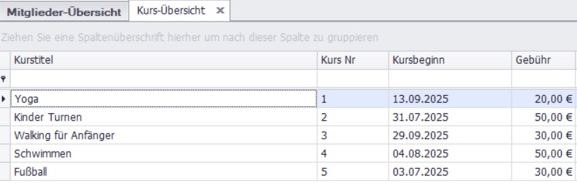 Nach Auswahl des Menüpunkts Kursübersicht werden alle gespeicherten Kurse innerhalb einer separaten Registerkarte angezeigt: