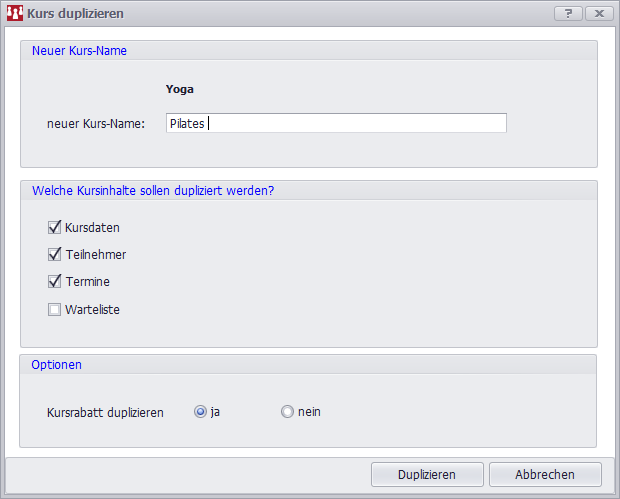 Dupliziert einen bestehenden Kurs. Im Anschluss können Sie einen Namen vergeben und entscheiden, welche Inhalte dupliziert werden sollen.