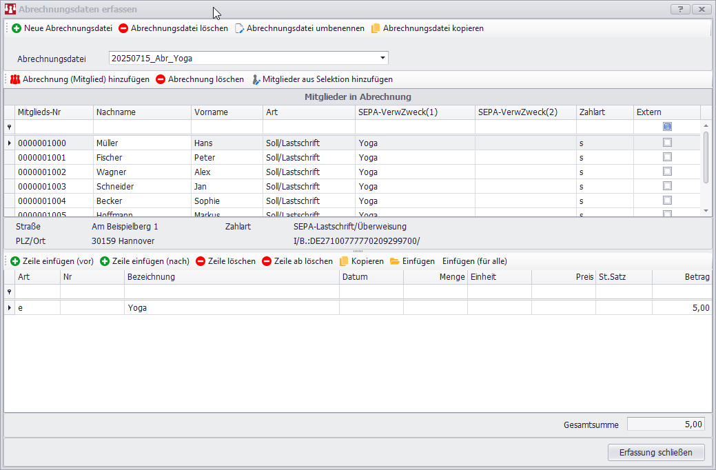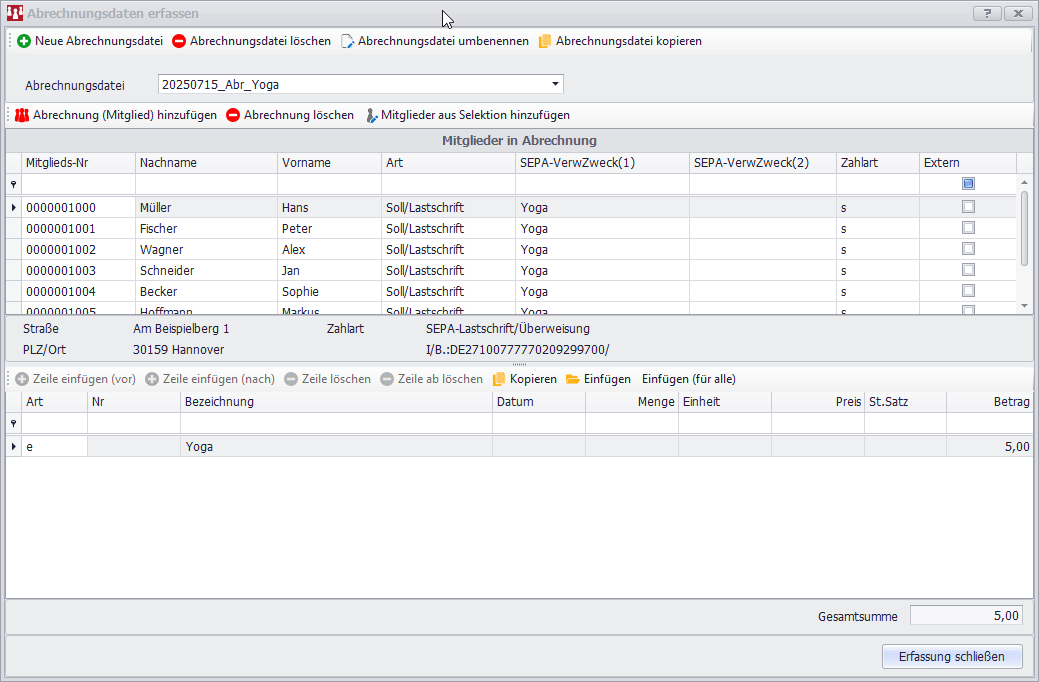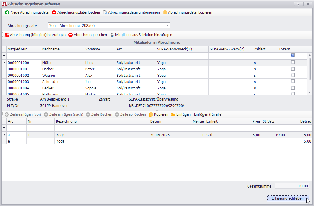 Im darunter liegenden Bereich finden Sie detaillierte Informationen zur Abrechnung des ausgewählten Mitglieds: