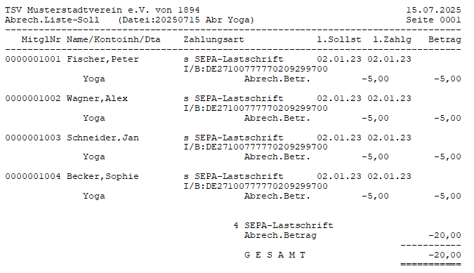 In der folgenden Liste sehen Sie die jeweiligen Details der Kursabrechnung auf Mitgliederebene.