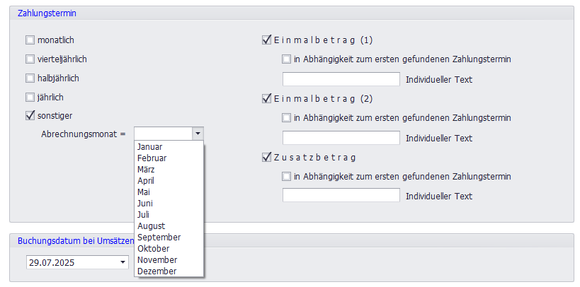 Die Erhebung eines in den Mitgliederdaten eingetragenen 'Einmalbetrages 1/2' oder eines 'Zusatzbetrages' kann auch in Abhängigkeit vom Zahlungstermin erfolgen. Wenn diese Möglichkeit gewählt wird, erfolgt die Erhebung des Einmal- bzw. Zusatzbetrages nur dann, wenn aufgrund eines vorgegebenen Zahlungstermins (z. B. monatlich) ein zu zahlender Beitrag ermittelt wird. Der zu zahlende Beitrag kann dabei auch 0,00 € betragen; dies kann als Schalter für den Einzug dieser Sonderbeiträge genutzt werden.