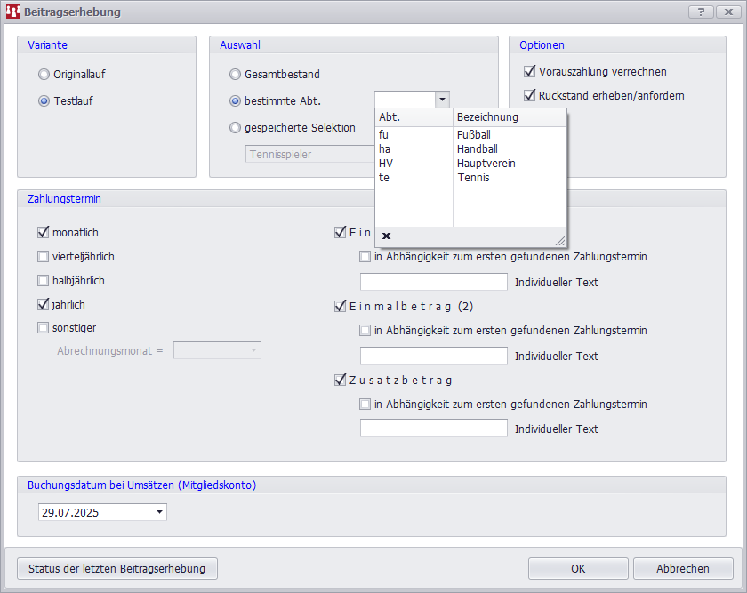 - bestimmte Abteilung: Es wird nur der Beitrag für die von Ihnen gewählte Abteilung von den entsprechenden Mitgliedern erhoben.