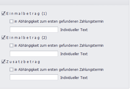 Für die Felder Einmalbetrag (1), Einmalbetrag (2) und Zusatzbetrag können Sie individuelle Texte vergeben. Bleiben diese Felder leer, werden die Standardwerte 'Einmalbetrag 1', 'Einmalbetrag 2' oder 'Zusatzbetrag' angezeigt.