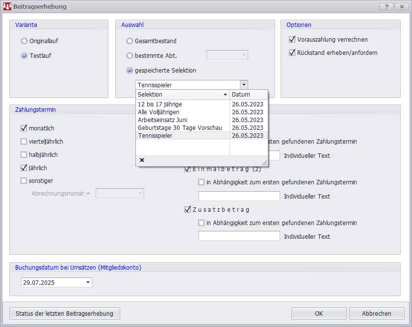 - gespeicherte Selektion: Es wird nur der Beitrag von den Mitgliedern erhoben, die in der von Ihnen gewählten Selektion gespeichert sind.