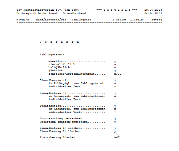 Mit der Variante 'Testlauf' können Sie eine Simulation der Beitragserhebung durchführen. Hierbei finden keine Änderungen im Datenbestand statt. Ein Testlauf kann mehrmals, auch mit unterschiedlichen Einstellungen, wiederholt werden.