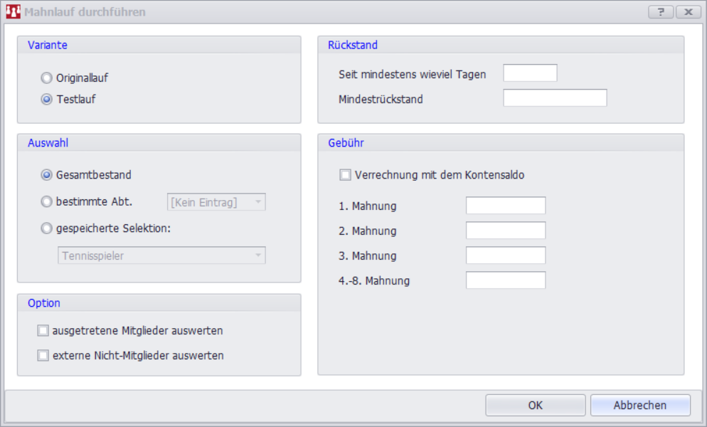 Weiterhin haben Sie die Möglichkeit ausgetretene oder externe Mitglieder in dem Mahnlauf zu berücksichtigen. | |