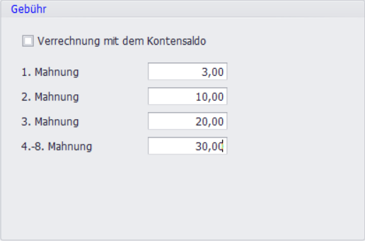 Unter Gebühr können Sie je nach Mahnungsanzahl eine Gebühr erheben. Die Gebühr kann auch optional mit dem Kontosaldo verrechnet werden.