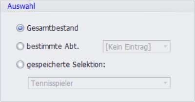 Für den Mahnlauf können Sie einstellen, ob bei der Erstellung der Mahnungen der Gesamtbestand, bestimmte Abteilungen oder eine gespeicherte Selektion. | |