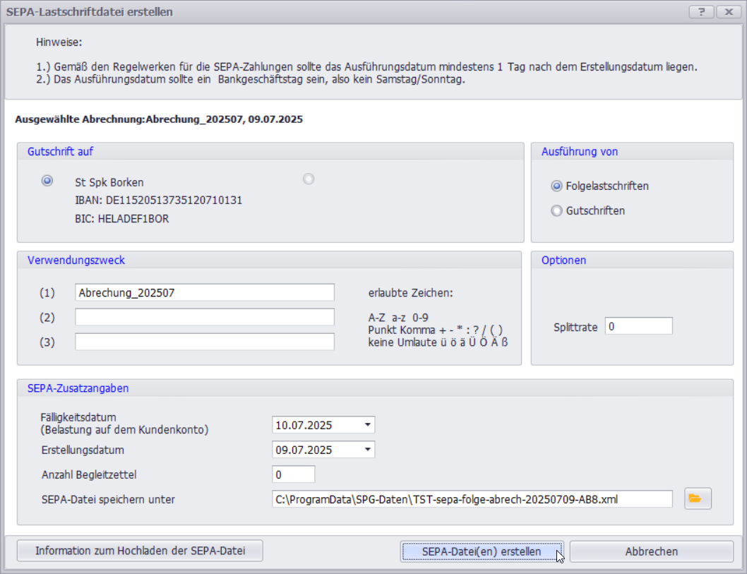 Überprüfen Sie die hinterlegten Informationen und bestätigen Sie mit SEPA-Datei(en) erstellen: