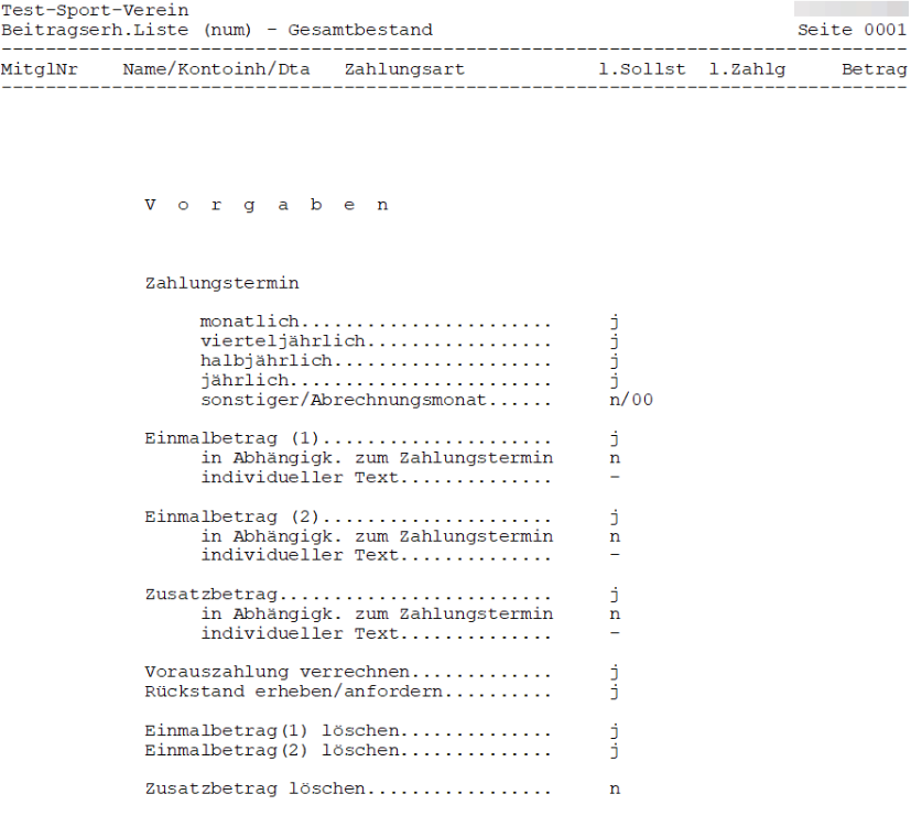 Der eigentlichen Beitragserhebungsliste wird eine Seite vorangestellt, auf der die Vorgaben aus der Maske Beitragserhebung aufgeführt sind. Sollte es sich bei der angezeigten Liste um einen Testlauf handeln, wird in der ersten Zeile jeder Seite der Hinweis TESTLAUF deutlich ausgewiesen.
