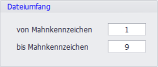 Im Feld „Dateiumfang“ legen Sie fest, welche Mahnungen ausgegeben werden sollen. Dies geschieht über die Angabe eines Bereichs von Mahnkennzeichen (Anzahl der Mahnungen). So kann die Ausgabe auf bestimmte Mahnungen beschränkt werden. | |