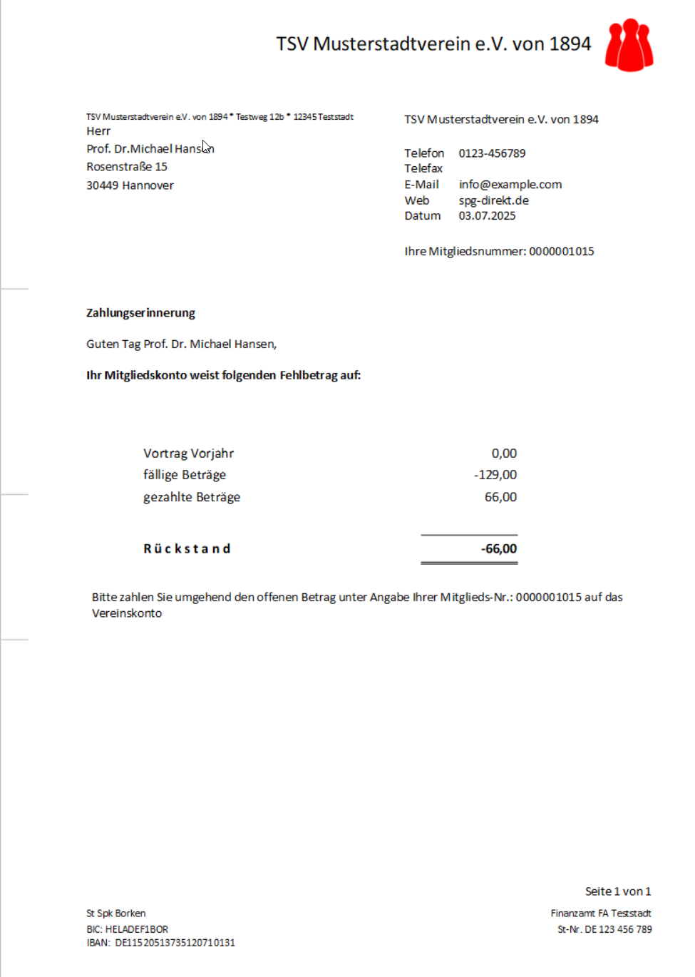 Mit SPG-Verein stehen Ihnen verschiedene Muster-Layouts für Mahnungen zur Verfügung. Sie können ein vorhandenes Layout verwenden oder ein eigenes, angepasstes Mahnformular gestalten (List & Label)