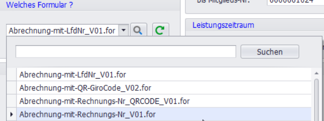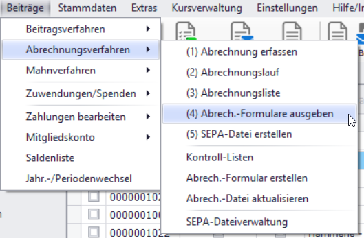 Menüleiste: Beiträge > Abrechnungsverfahren > Abrechnungsformulare ausgeben