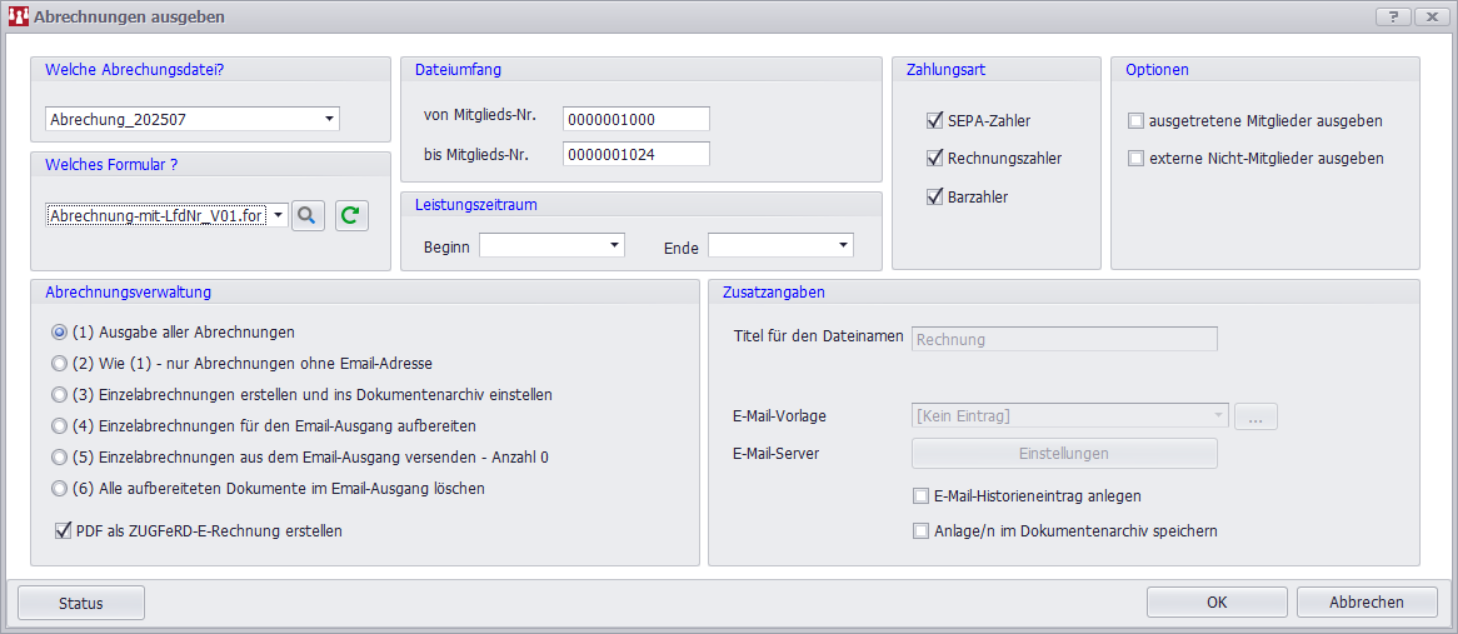 In dem sich öffnenden Formular können Sie die Parameter für die Ausgabe des Abrechnungsformulars definieren: