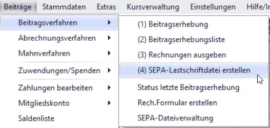 Die Funktion SEPA-Datei erstellen ermöglicht das Erzeugen einer SEPA-XML-Datei, über die die fälligen Mitgliedsbeiträge per Lastschrift eingezogen werden. Die erstellte Datei muss über das Internet bei der Sparkasse oder dem jeweiligen Kreditinstitut des Vereins hochgeladen werden.