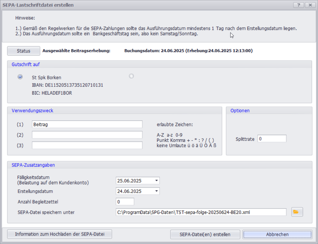 Erstellungsdatum (Default=Programmdatum) | Das Erstellungsdatum der SEPA-Datei. Die Sparkasse überprüft beim Hochladen, ob der Zeitraum zwischen Erstellungs- und Fälligkeitsdatum zulässig ist. Wird eine bestimmte Zeitspanne überschritten, kann die Datei abgewiesen werden. |
