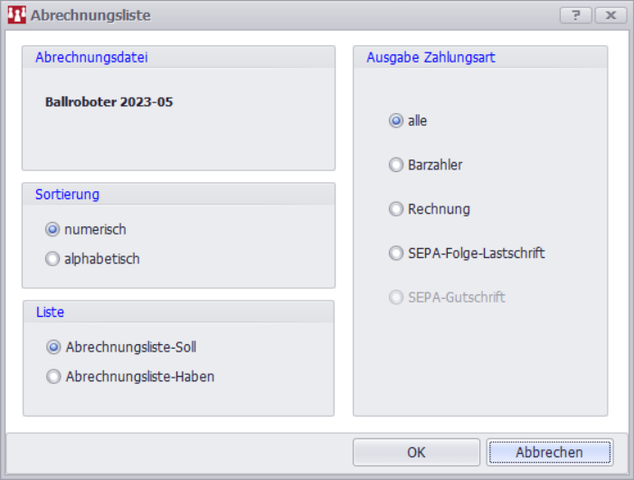 Erstellt eine Abrechnungsliste für die ausgewählte Abrechnung.