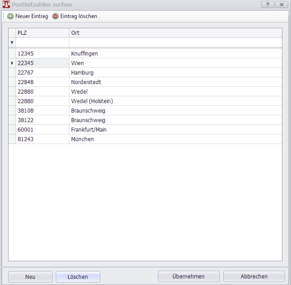 Postleitzahl: 5-stellige Eingabe. Bei Bestätigung erfolgt eine automatische Prüfung anhand der Postleitzahlen-Datenbank. Bereits verwendete PLZ/Ort-Kombinationen werden im internen Verzeichnis gespeichert und können bearbeitet werden.