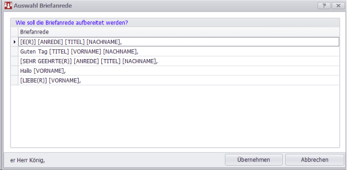Briefanrede: Individuelle Formulierung möglich. Automatische Bildung aus Anrede, Titel und Nachname per Schaltfläche. Verschiedene Vorlagen können unter Einstellungen > Bestand