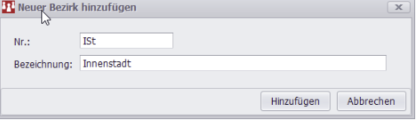 Bezirk: Feld zur räumlichen Zuordnung und Auswertung. Auswahl aus Stammdaten oder individuelle Ergänzung möglich.