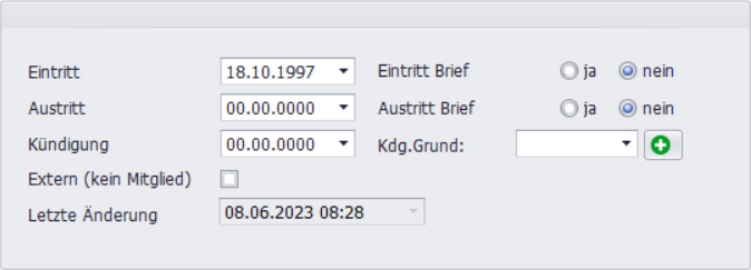 Austrittsbrief: Dokumentation des schriftlichen Austritts. Werte: „j“ = ja, „n“ = nein.