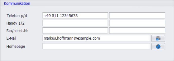 Telefon privat/dienstlich, Handy 1/2, Telefax, Sonstige Nr.: Flexible Formate erlaubt, z. B. 05171/12345, (05171)12345.