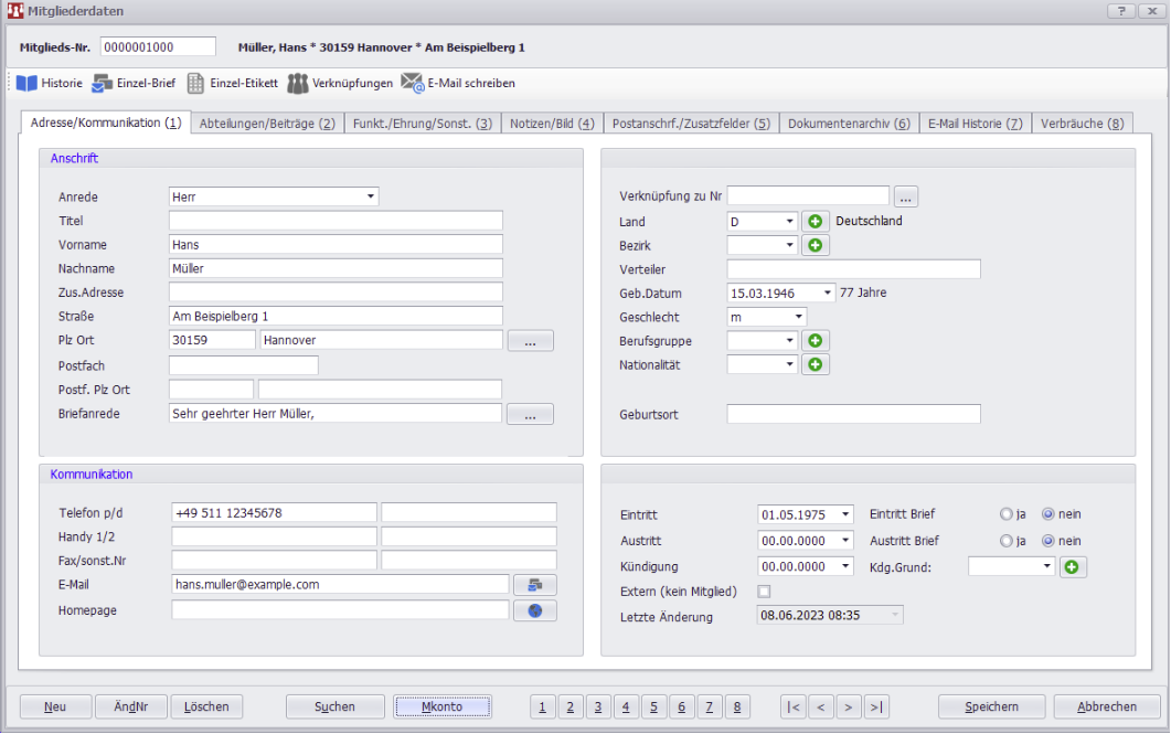 Jedes Vereinsmitglied wird im System unter einer eindeutigen, frei wählbaren, 10-stelligen Mitgliedsnummer geführt. Es empfiehlt sich die Vergabe fortlaufender Nummern oder eine strukturierte Unterteilung (z. B. für Familienmitglieder). Nach Auswahl oder Anlage eines Mitglieds erscheinen alle relevanten Felder zur Adress- und Kommunikationspflege: