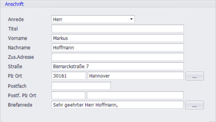 Anrede: Auswahl oder individuelle Eingabe, z. B. Herrn, Frau, Eheleute, Firma. Die Auswahl beeinflusst automatisch das Feld „Geschlecht“.